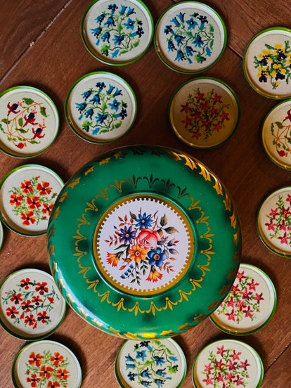 Kleurrijke onderzetters van blik in verschillende pixel- of borduurpatronen. Ze zijn vintage, dus hebben een kleine gebruikssporen.