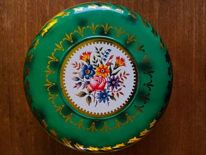 Vintage koekblik, doorsnede 22 cm. Met gebruikssporen.