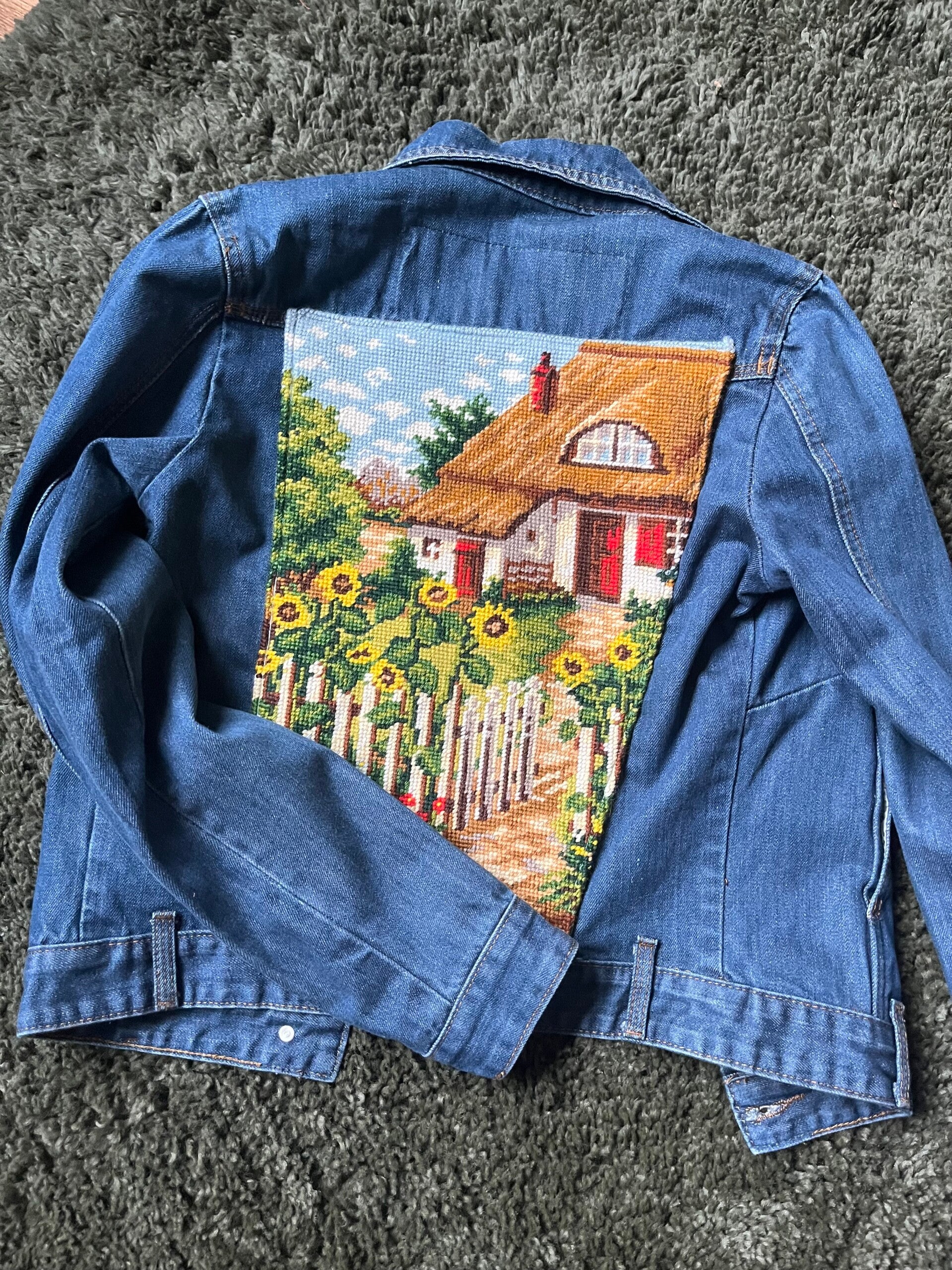 Dit Franse spijkerjasje is upcycled met een vintage borduurwerk van een Engelse cottage. De bijbehorende waterput vind je terug op de rechterbovenzak aan de voorzijde.