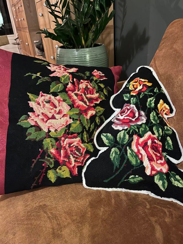 Van een prachtig vintage borduurwerk maakten we deze kussenhoes. Inclusief kussen.