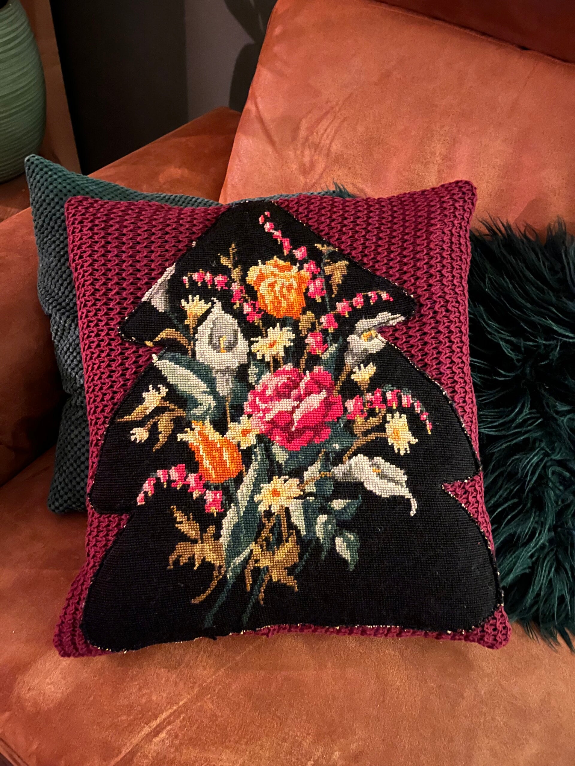 Dit kussen is gemaakt van een donkerrood breiwerk, waarop een vintage borduurwerk in de vorm van een kerstboom is gemaakt. De achterzijde van het kussen is donkerrood, met een klein gouden shimmertje erin. De hoes sluit met klittenband. Inclusief nieuw binnenkussen.
