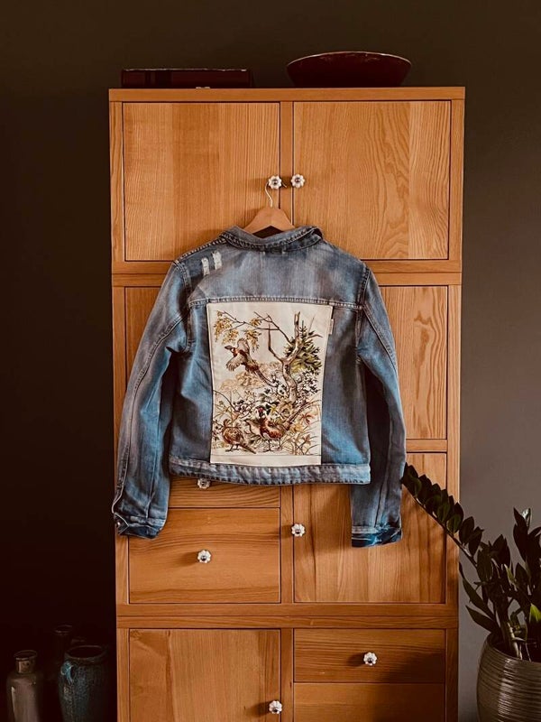 Dit denim jacket is van het merk Noisy May. Distressed op de schouders. Het is upcycled met een fijn borduurwerk aan de achterzijde, dat fazanten in het wild voorstelt.