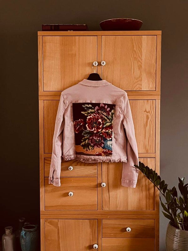 Nieuw distressed, kort jasje met vintage borduurwerk op de achterzijde. In het borduurwerk komt de kleur van het jasje terug. Het jasje heeft een gerafelde onderkant.