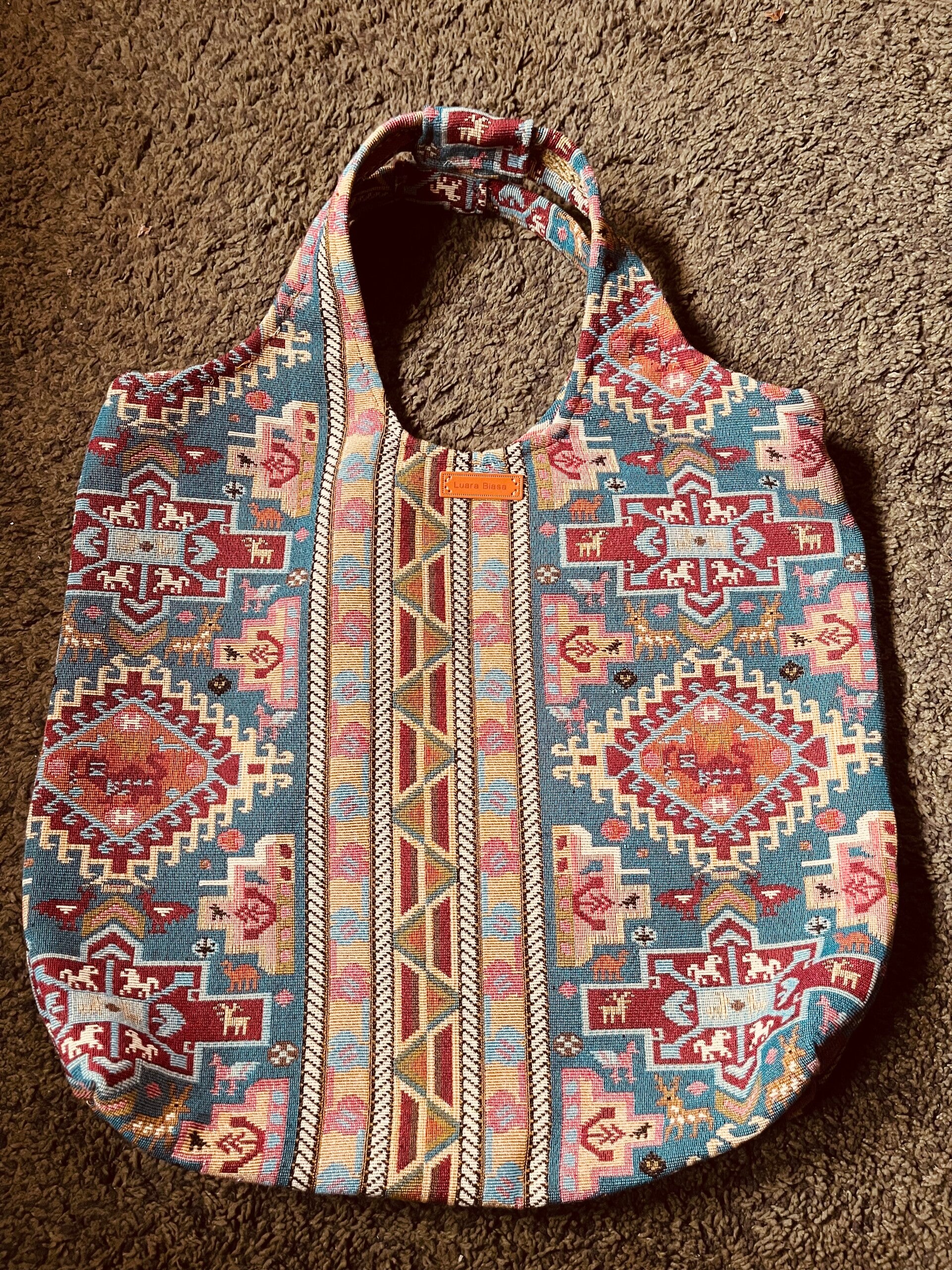 Gemaakt van nieuwe, zeer sterke gobelin. De tas heeft een platte bodem van 9 cm.