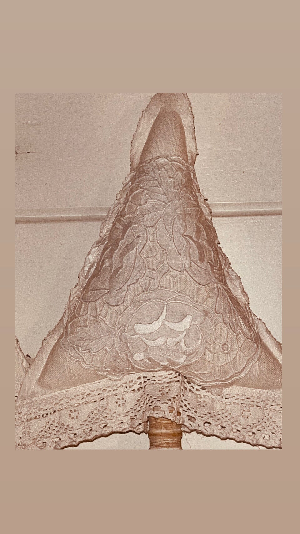 Deze decoratieve boompjes zijn gemaakt van haakwerk, kant en staanders die voorheen gebruikt werden voor tafellampen. Ze worden als set verkocht.