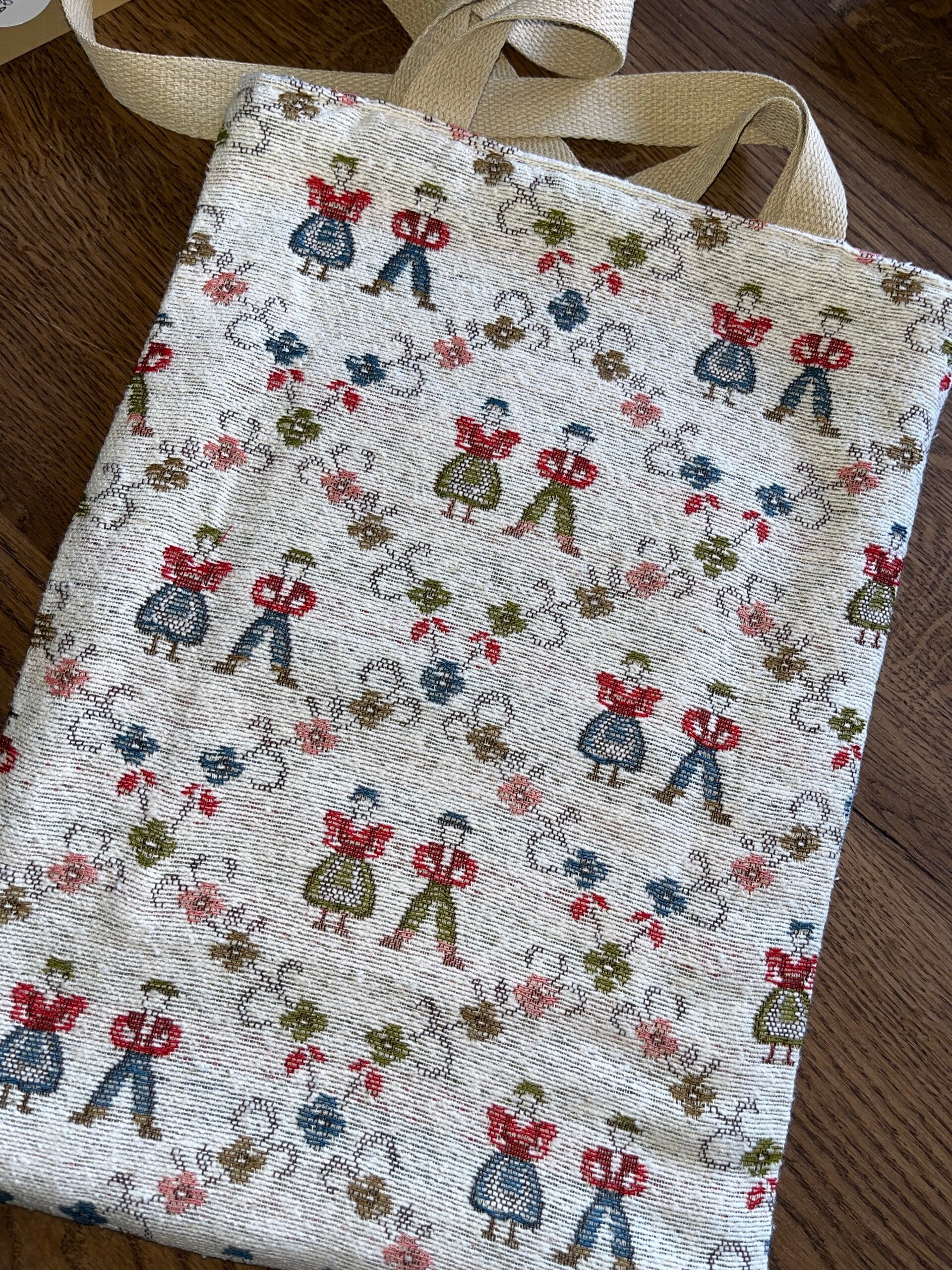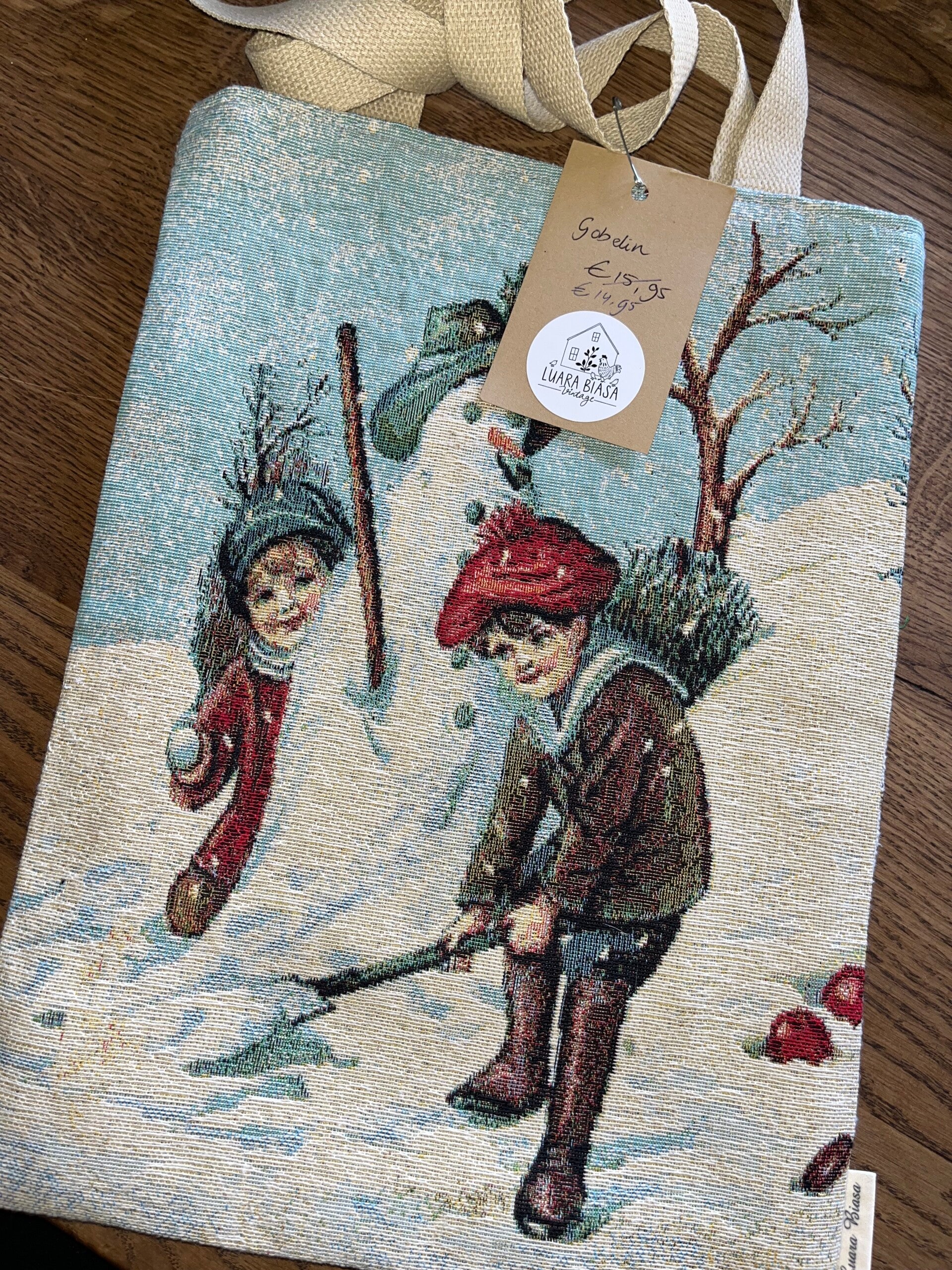 Tas gemaakt van prachtige gobelin met een nostalgische print van twee spelende kinderen in de sneeuw. Gevoerd, met binnenzak. Achterzijde is ook van gobelin, in een andere print.