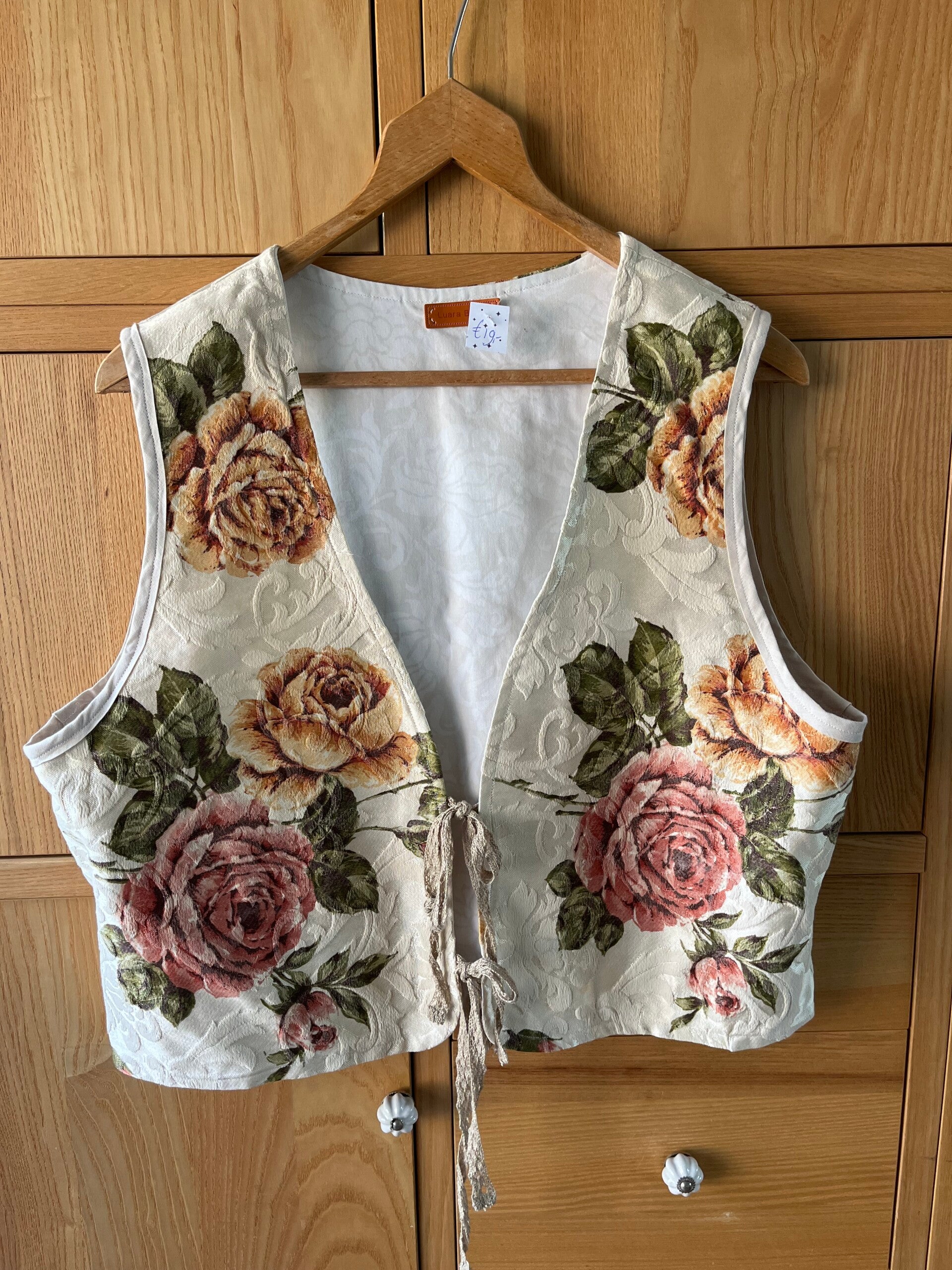 Gemaakt van een mooie stof in 3D geweven, in de prachtige kleuren oranjegeel, rozerood en groen. Gevoerd en afgewerkt met lint in de armsgaten. Het gilet sluit met machinaal gehaakt lint.