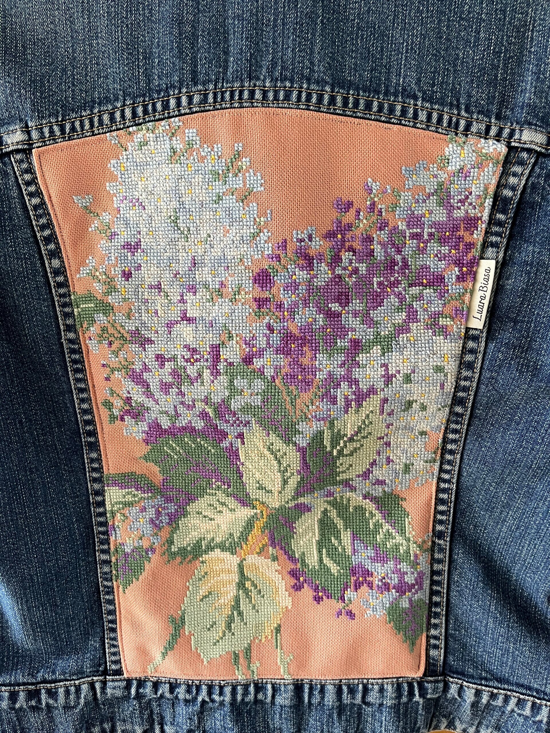 Stevig jasje met rits, van het merk Original Swish Jeans. Upcycled met een borduurwerk van paarsblauwe punthortensia's op oudroze. De kleuren in het borduursel combineren geweldig met de kleur van het jasje.