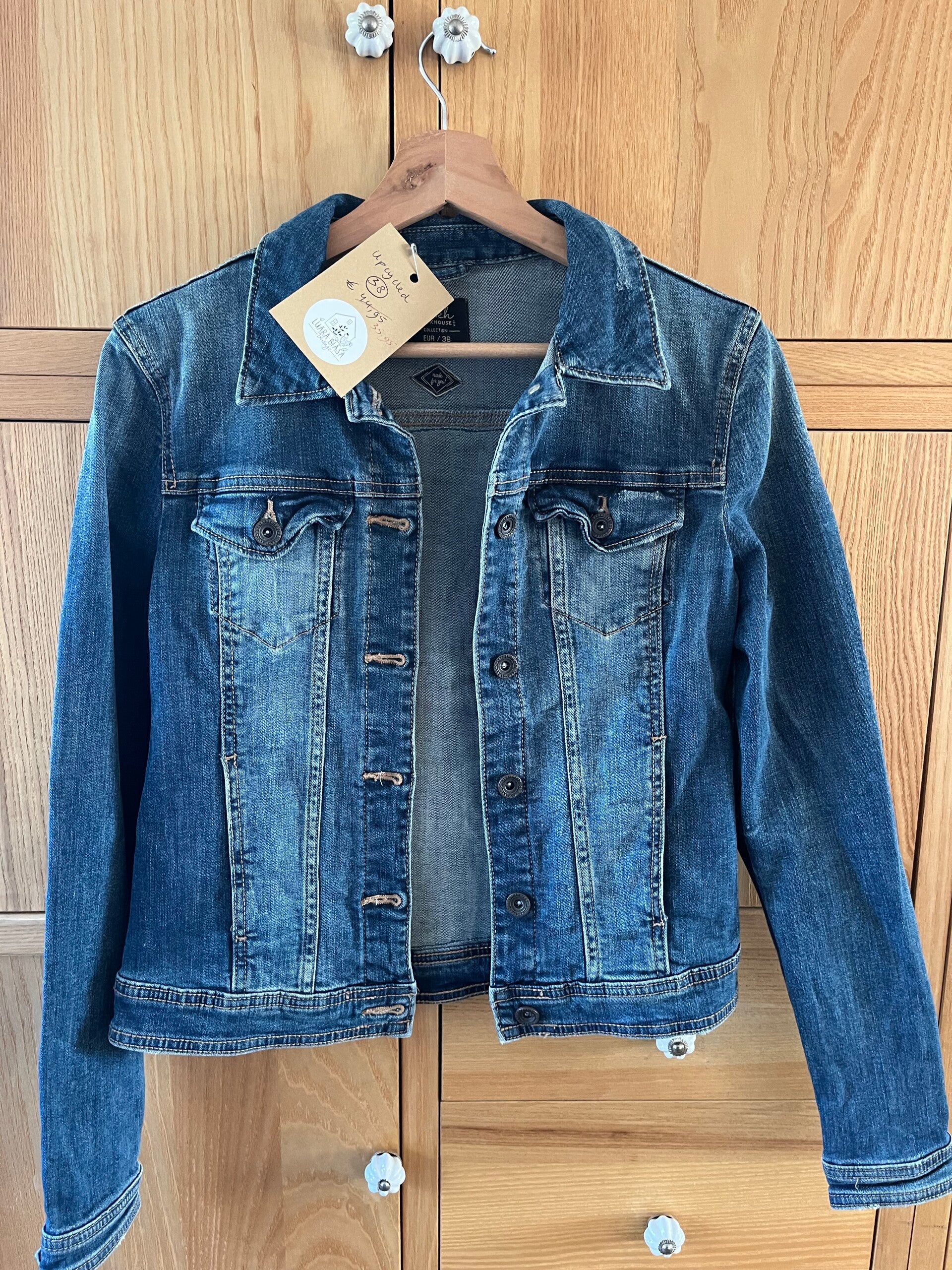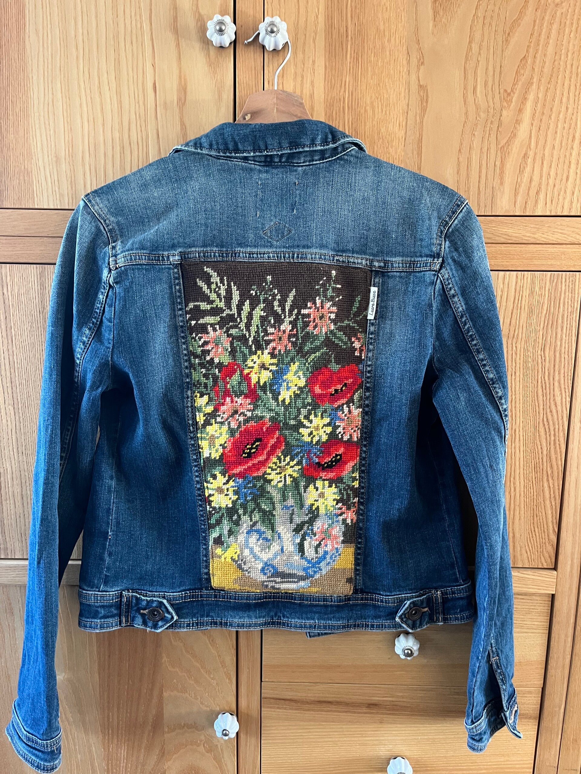 Dit spijkerjasje van het merk Clockhouse is upcycled met een kleurrijk borduurwerk van een veldboeket aan de achterzijde.