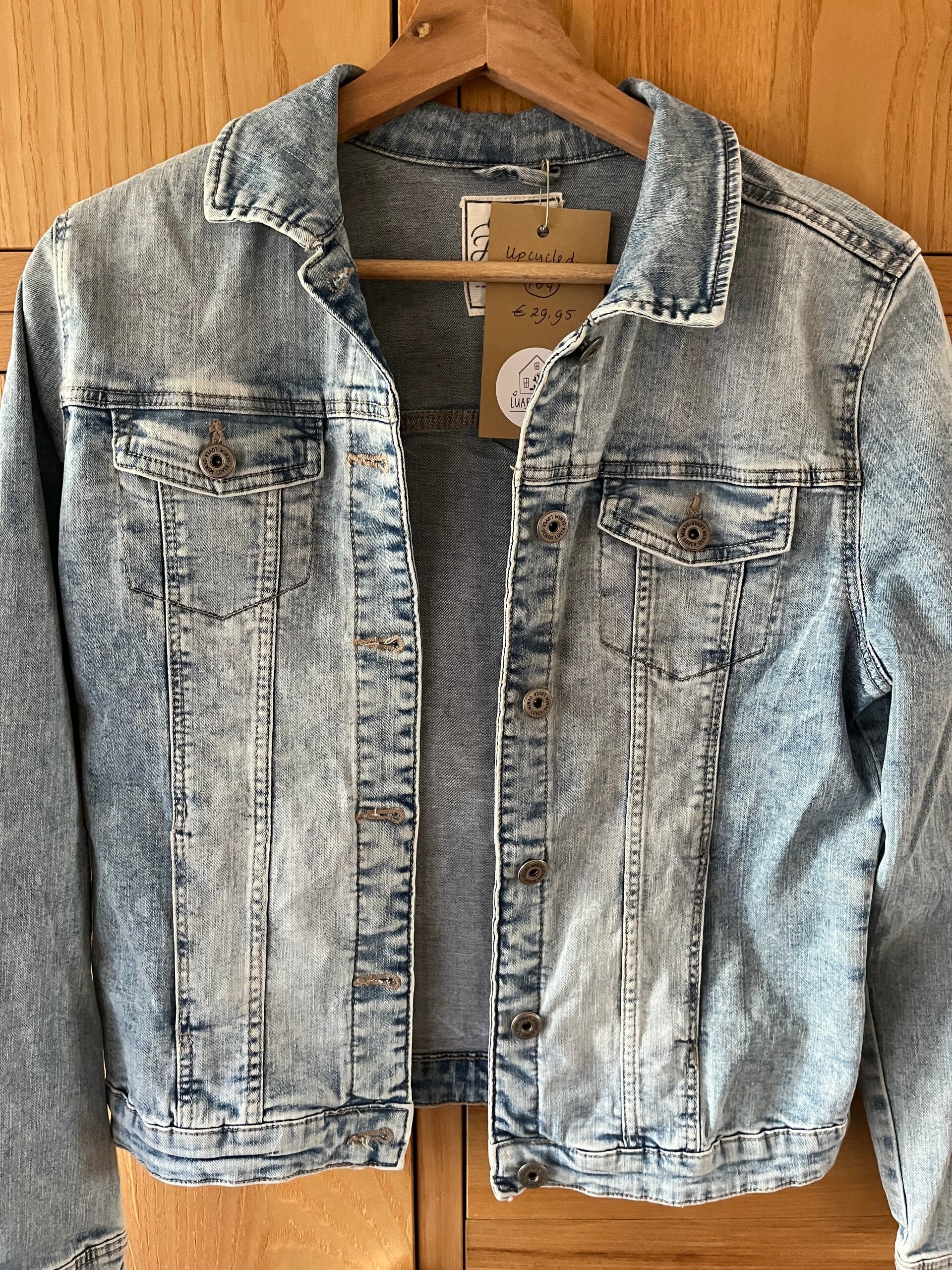 Prachtig lichtblauw jasje met een deel van een vintage merklap op de achterkant. Maat 164.