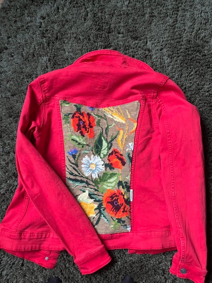 Dit spijkerjasje van het merk Clockhouse is upcycled met een kleurrijk borduurwerk van een veldboeket aan de achterzijde.