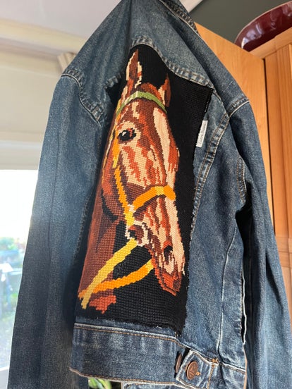 Bij borduurwerken op een zwarte ondergrond knallen de kleuren eruit. Dit veldboeket is ronduit prachtig. Het blauw in de bloemen is precies dezelfde kleur als die van het jasje.